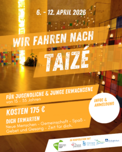 In Kooperation mit weiteren Partnern (Dekanat Paderborn, Dekanat Büren-Delbrück, Dekanat Märkisches Sauerland und Alt-katholische Gemeinde) fahren wir in der Osterwoche 2026 (06.-12.04.26) nach Taizé.